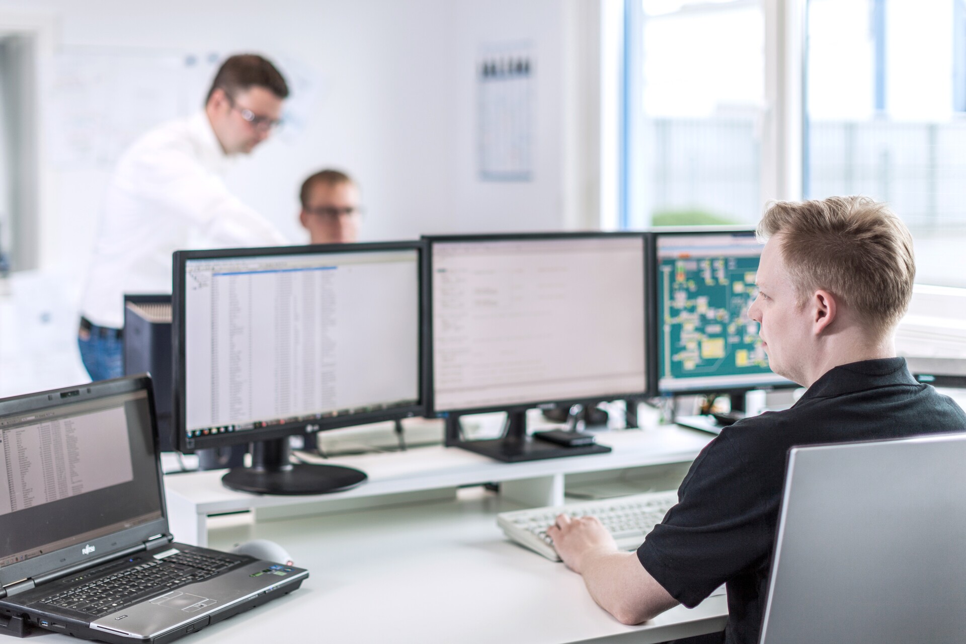 Sie stellen die gesamten Produktionsabläufe dar. Dabei ist die zu steuernde Anlage als Fließbild auf Monitoren visualisiert.